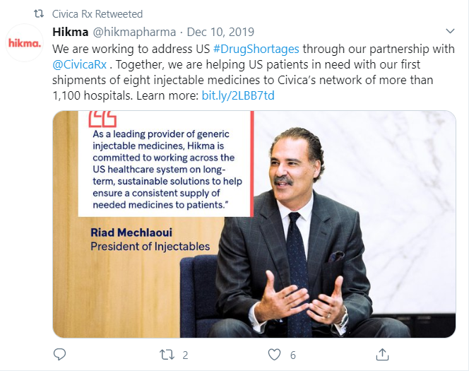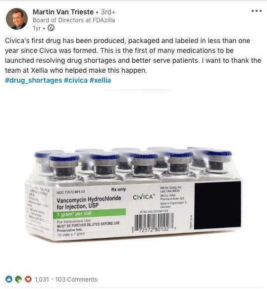 “Civica’s first drug has been produced, packaged and labeled in less than one year since Civica was formed. This is the first of many medications to be launched resolving drug shortages and to better serve patients.”