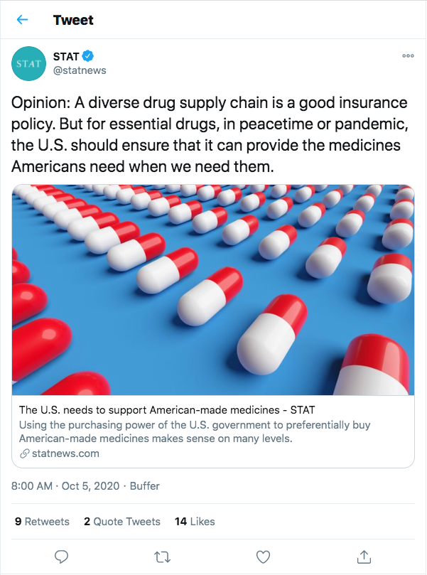“The global coronavirus pandemic has highlighted weaknesses in the U.S. supply chain for essential medicines and other medical supplies…Many of the medicines used to manage COVID-19, including the sedatives and neuromuscular blocking agents essential for patients on ventilators, were already in short supply prior to the pandemic…Facing low margins and uncertain sales, companies are discouraged from investing in quality and incentivized to move production out of the U.S. to economies with lower labor costs, lower regulatory compliance costs and where they may receive direct or indirect support from foreign governments to build new facilities.”