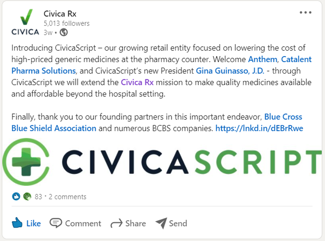CivicaScript, the Newly Named Civica Initiative to Serve Patients in Retail Markets, Announces a New Health Plan Partner, a New President, and a New Drug Manufacturing Partner