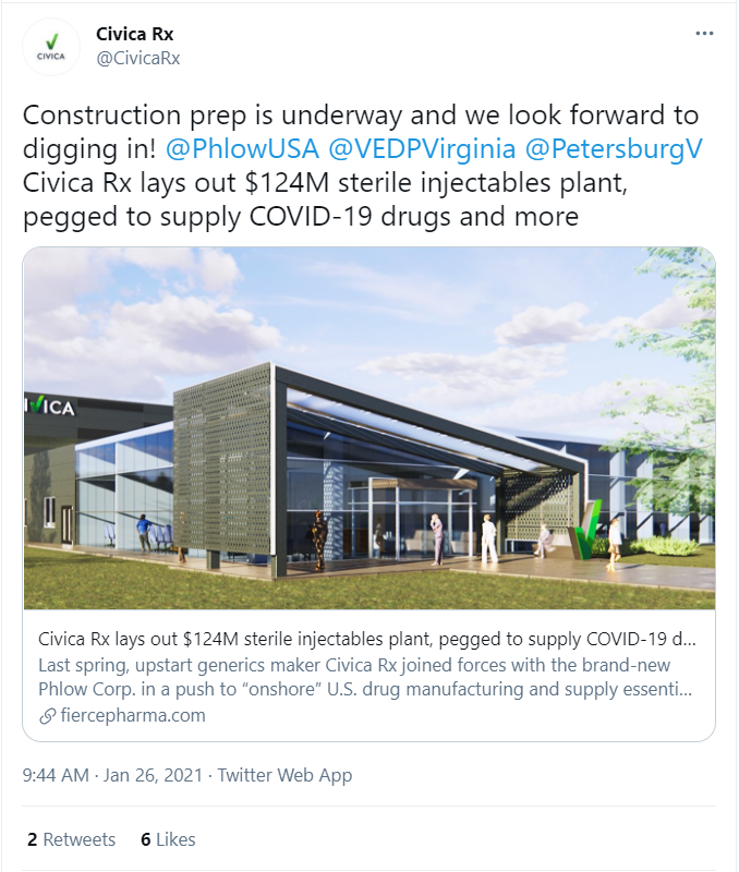 Civica Rx to Build Manufacturing Facility in Virginia, Creating 180 Jobs