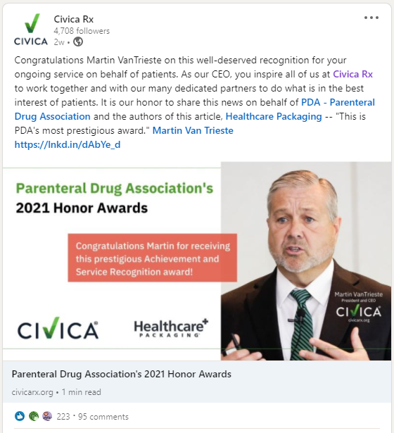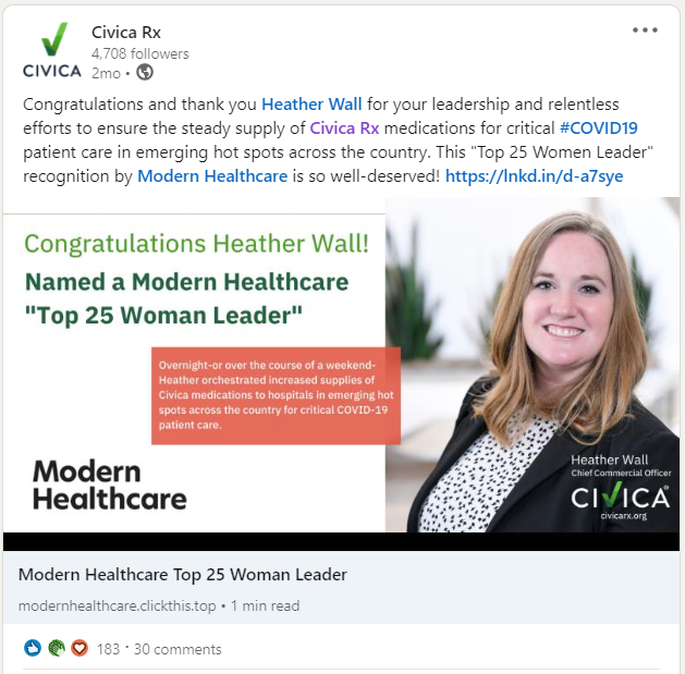 “Civica Rx was started three years ago by a hospital consortium. It now provides over 50 generic injectable medicines in chronic shortage to more than 1,400 hospital members and the Veterans Affairs and Defense departments. It already has sold enough medication to treat 17 million people, including many hospitalized with COVID-19. Now it’s expanding to help patients directly.”
