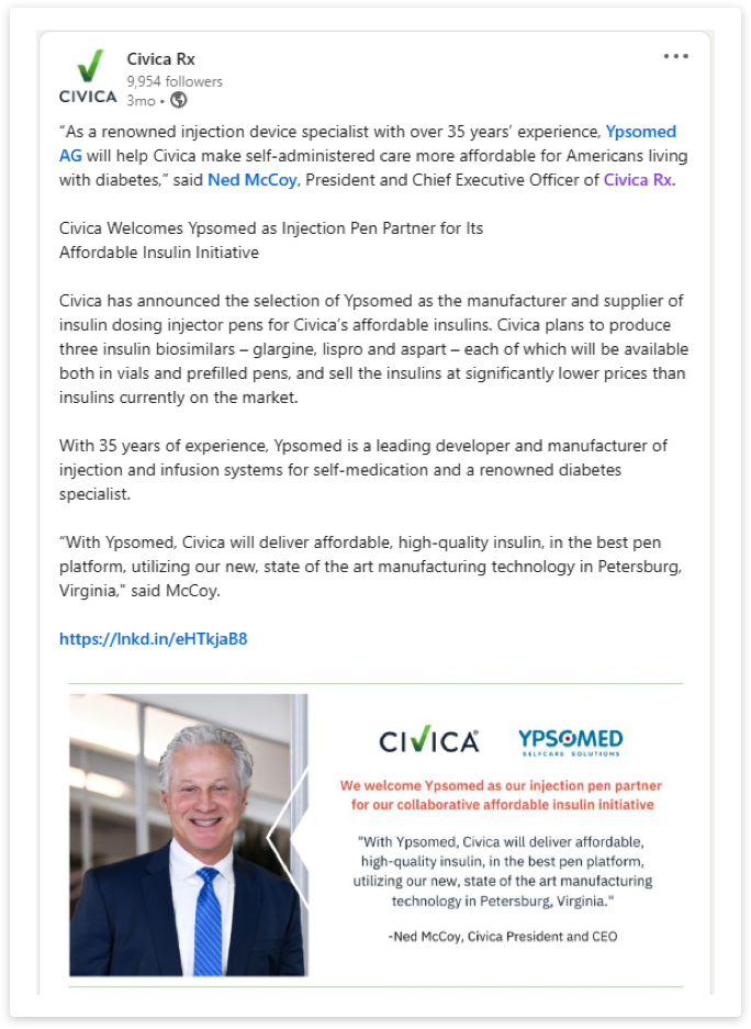 “As a renowned injection device specialist with over 35 years’ experience, Ypsomed will help Civica make self-administered care more affordable for Americans living with diabetes,” said Ned McCoy, President and Chief Executive Officer of Civica. “Civica will deliver affordable, high-quality insulin, in the best pen platform, utilizing our new, state of the art manufacturing technology in Petersburg, Virginia.”
