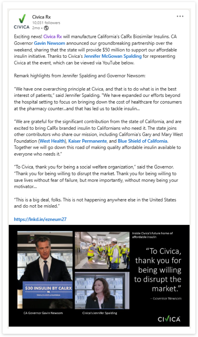 California’s partnership with Civica is a game changer,” said California Governor Gavin Newsom, announcing the state’s choice of Civica to manufacture insulins for the State of California’s CalRx Biosimilar Insulin Initiative. “We are proud to be working with Civica to bring true price competition into the insulin drug market and ease the financial burden for Californians living with diabetes.”