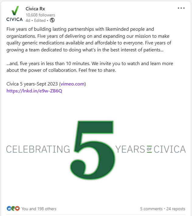 Today, we celebrate Civica’s 5th Anniversary! Five years of building our talented team and lasting partnerships with likeminded organizations. Five years of delivering on and expanding our mission to make quality generic medications available and affordable to everyone. And, five years of doing what is in the best interest of patients.
