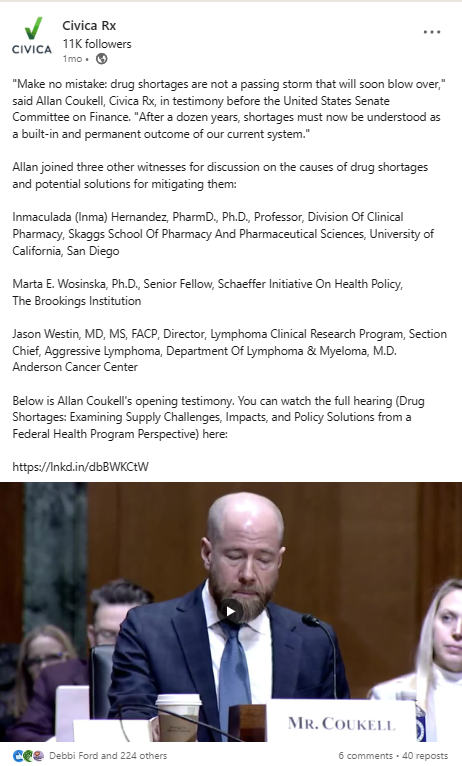 Civica Testifies on Drug Shortages before the U.S. Senate Finance Committee