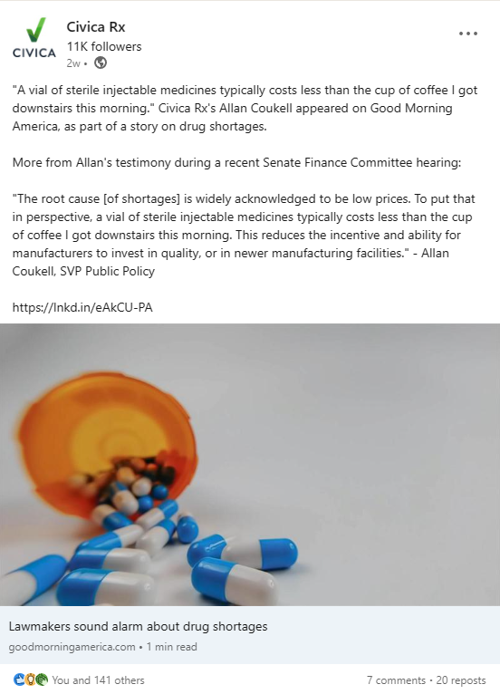 Civica President and CEO Ned McCoy welcomed the bill, saying, “The focus on creating additional safety stock inventory within the supply chain and on upgrading aging generic drug manufacturing infrastructure…have the potential to significantly reduce shortages.”